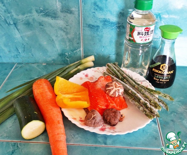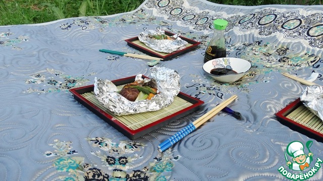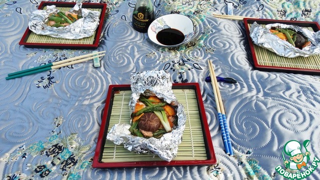 | Для этого блюда (японское название сака-муси) овощи и лососину заворачивают в фольгу и готовят на пару, на гриле, в духовке или на углях на решётке мангала в собственном соку с добавлением саке и соевого соуса. Чтобы красиво разложить в пакетиках из фольги рыбу и овощи, нужно будет потрудиться, зато, раскрыв пакетик, вы увидите нечто прекрасное, как летний сад. Такой способ приготовления - без капли масла, делает это блюдо совершенным для здорового питания. |