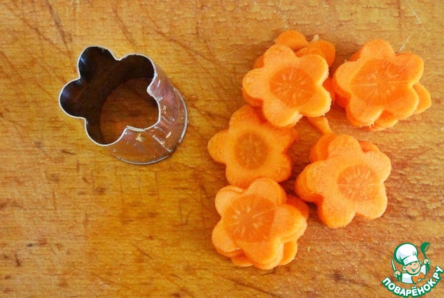 Морковь нарезать на специальной тёрке кружочками и вырезать с помощью специальной формы или с помощью ножа такие цветочки.