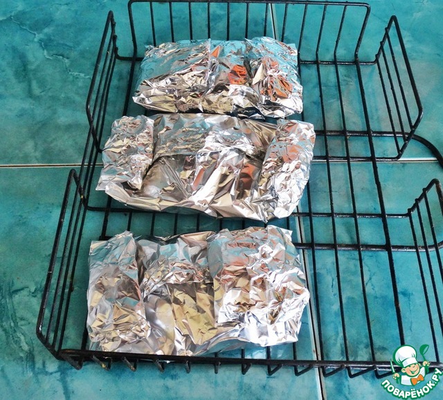 Сложить фольгу конвертом, запечатав каждый край. Сделать три конвертика на три порции. Сложить их на решётку.