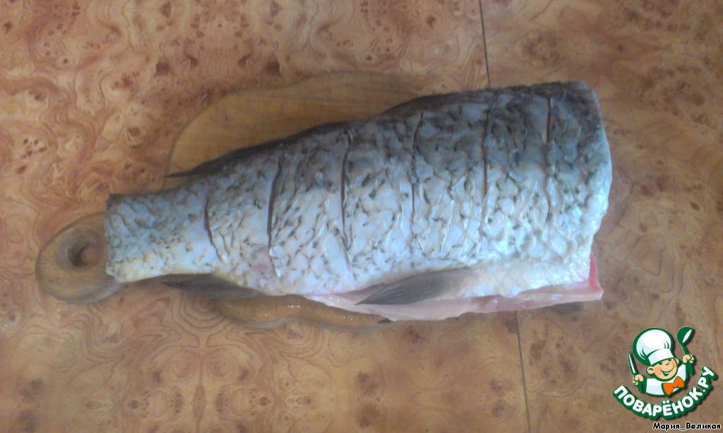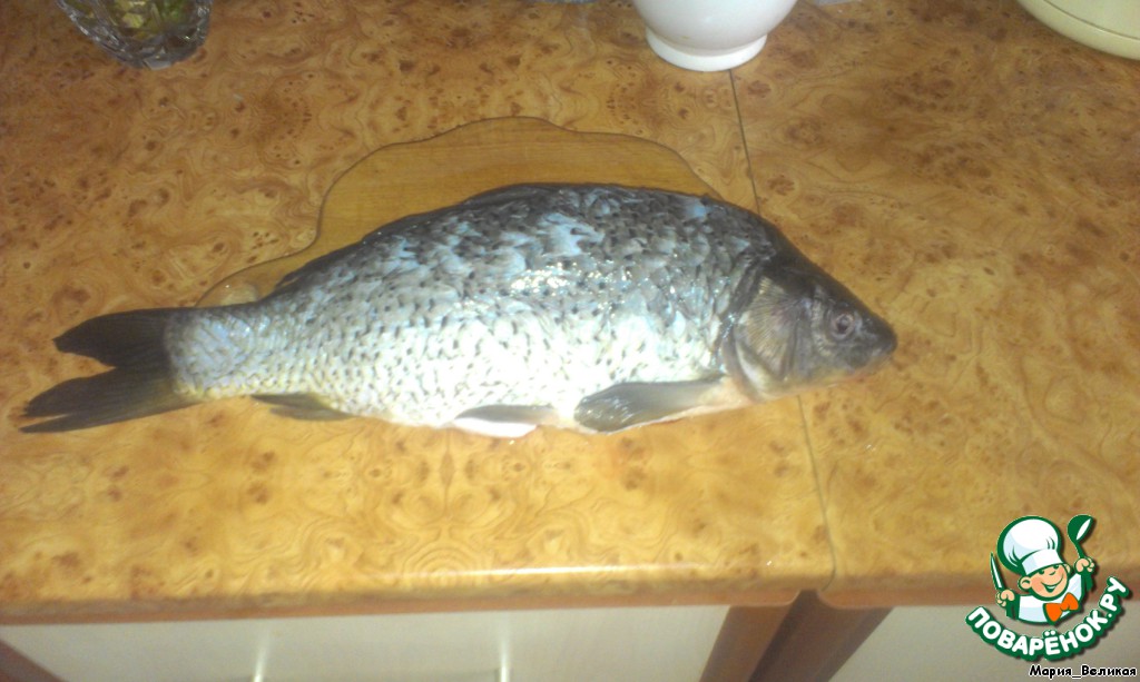 Покупаем (ловим самостоятельно))) свежего и упитанного карпа. Очищаем от шелухи, потрошим, моем.