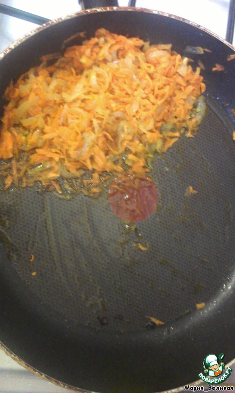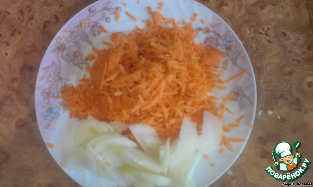 Морковь почистить и натереть на терке, лук порезать дольками.