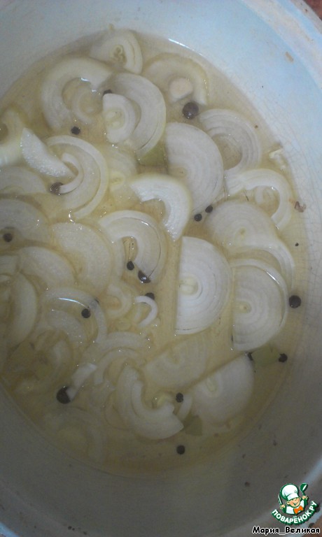 Подготовить емкость для запекания. Налить обильное количество масла, добавить несколько горошин черного и душистого перца, лавровый листик. Выложить лук кольцами или дольками.