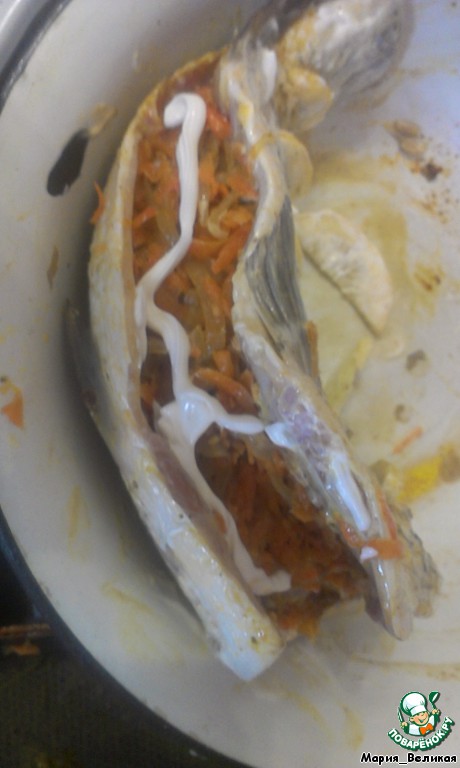 Плотно фаршируем рыбку зажаренным луком и морковью. Можно также добавить немного майонеза. Если зажарка вываливается, можно скрепить половинки рыбы зубочистками.