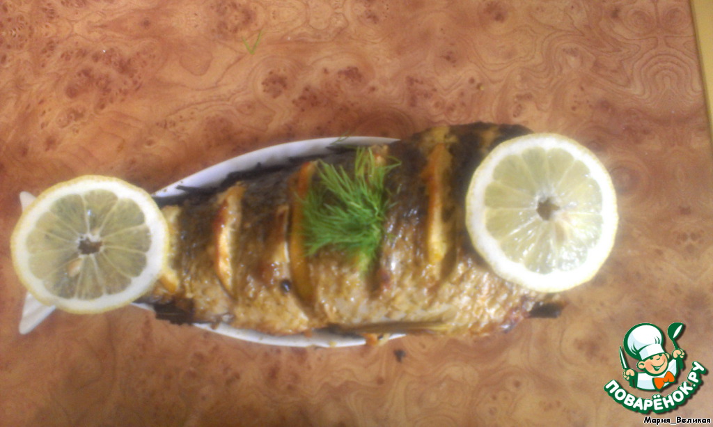 Наш карпуша готов! Выкладываем в красивое блюдо. Украсить вам поможет фантазия. Я ограничилась лимончиками и укропом. Вышла вот такая румяная и нежная рыбка!