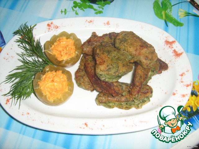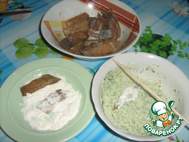 | Нежное рыбное филе жареное в шпинатно-майонезном тесте кляр. |