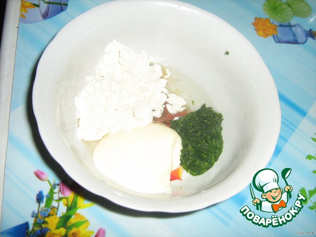 Делаем тесто:1таблетка шпината,1ст.л майонеза,1ст.л масла растительного,1 ст.л муки,1ст.л воды,солим.Всё перемешиваем.