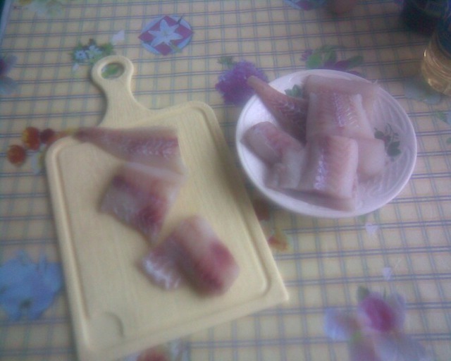 Рыбу разморозить, помыть, просушить полотенцем и разрезать на куски.