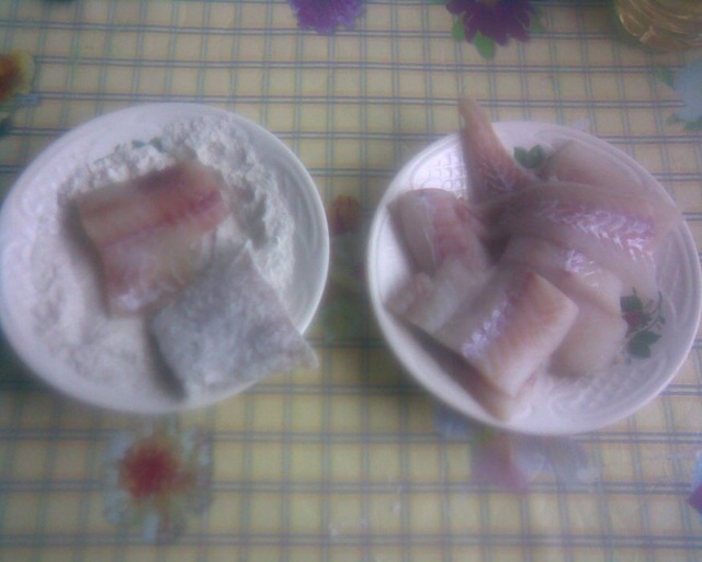 Каждый кусочек обвалять в муке с добавлением черного перца и обжарить на подсолнечном масле.