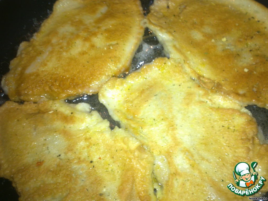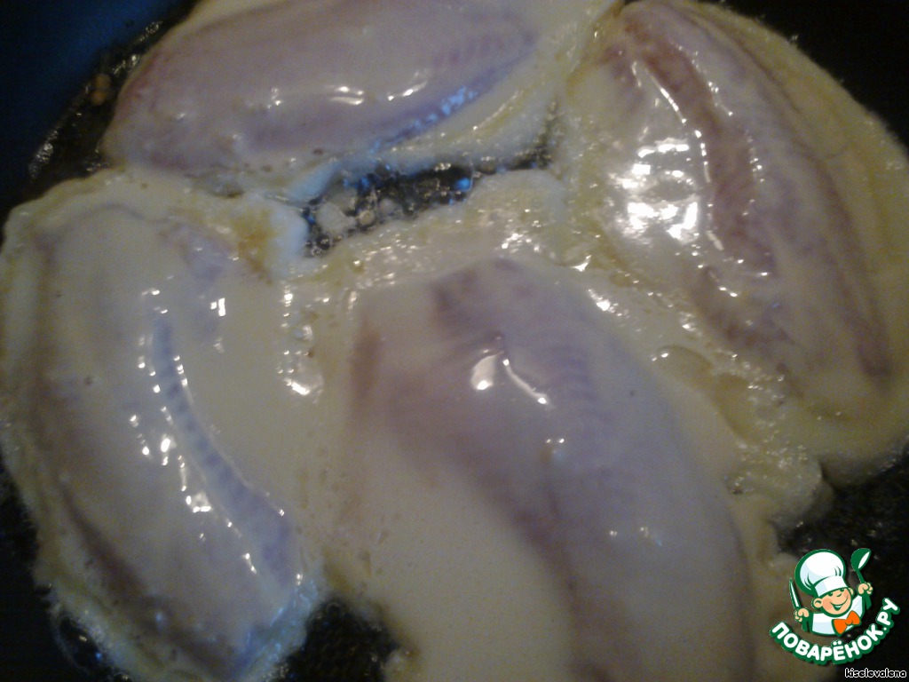 Обмакиваем филе в кляр и выкладываем на сковородку.