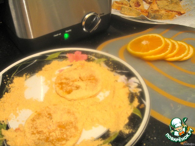 Рулеты из рыбы кефаль с жаренными апельсинами