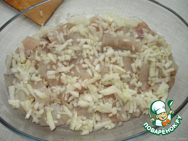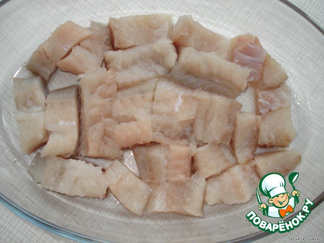 Филе рыбы порезать на кусочки и положить в блюдо для запекания.