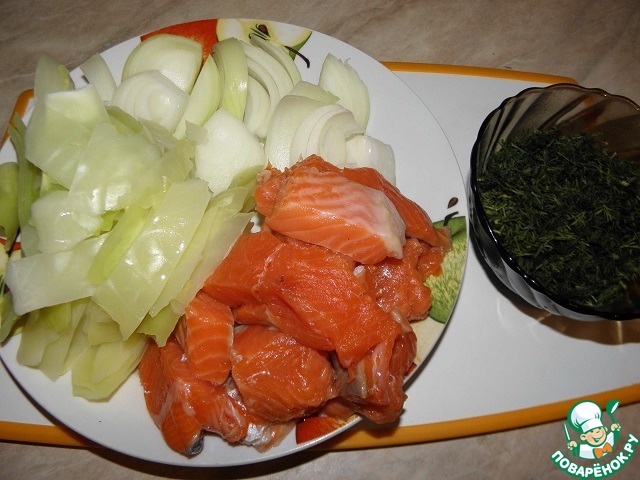 Капусту отварить 5 минут, нарезать средне, лук нарезать средне, рыбу нарезать средне, укроп измельчить.