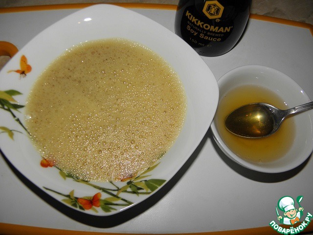 Мед размешать с вином, яйца взбить с соевым соусом, все вместе перемешать.