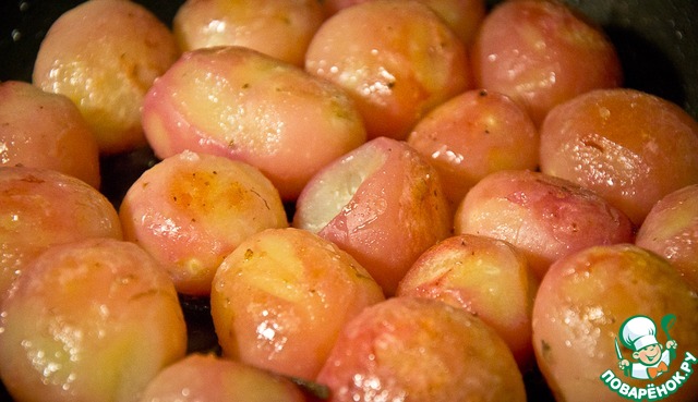 Параллельно с шедевром приготовим гарнир. Рекомендую молодой картофель. Картофель отварить в мундире, затем очистить его от шкурки и обжарить в растительном масле на сильном огне до румяной корочки.