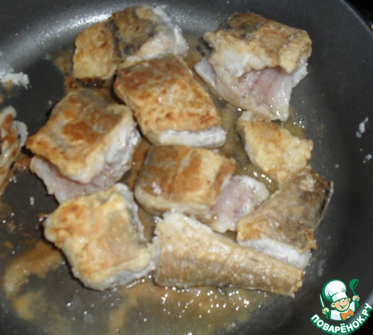 Кусочки минтая посолить, обвалять в муке и обжарить на среднем огне на растительном масле до золотистого цвета, примерно по 2-3 мин. с каждой стороны. Он не должен дойти до готовности, просто дайте муке "схватиться".