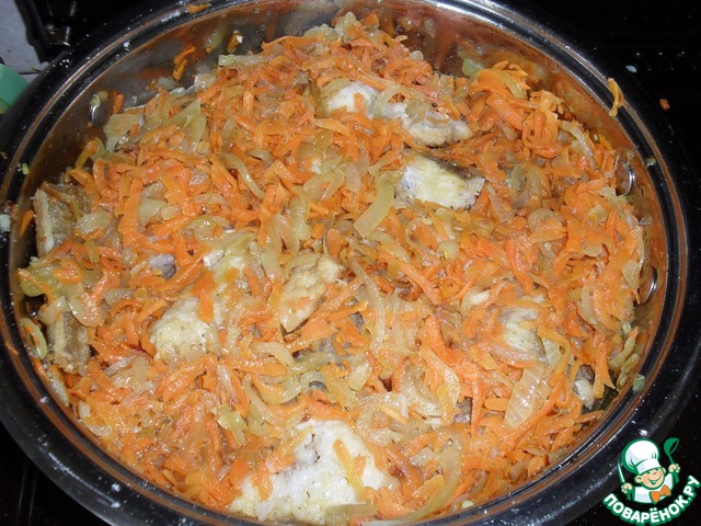 На обжаренные кусочки минтая сверху выложите приготовленные до этого овощи, залейте примерно 100-200 мл. воды и еще раз немного посолите.
