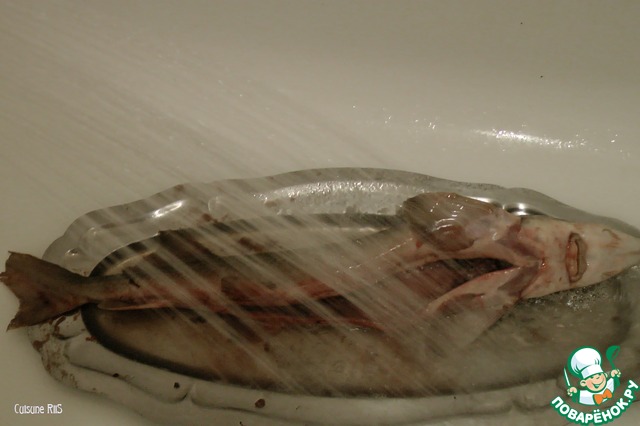 Перед началом разделки она была вынута из холодильника, часа два оттаивала. Попробовала чистить щеточкой, но кожа у рыбы нежная, и я это дело оставила. Включила посильней напор воды. Рядом был подготовлен чайник с кипятком, в заключение я обдала рыбу им.