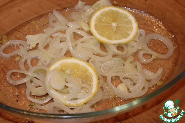 Лук нарезать кольцами. В форму, подходящую для использования в микроволновой печи, налить пару ложек оливкового масла, добавить масло сливочное. Плоской стороной ножа раздавить 2 зубчика чеснока. Пассировать лук с чесноком 1 минуту на максимальной мощности, перемешать и пассировать еще минуту. Выложите на луковую подушку пару колец лимона.