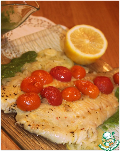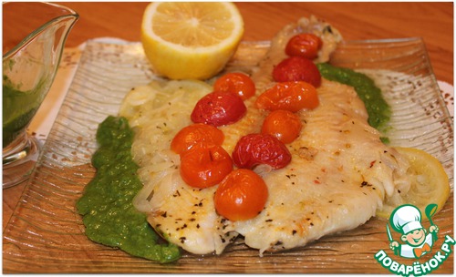 Филе тилапии с томатами черри, луком и соусом из рукколы