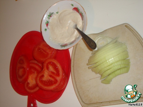 Майонез смешиваем с сыром, лук и помидоры нарезаем кольцами (либо полукольцами).