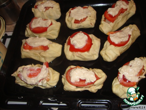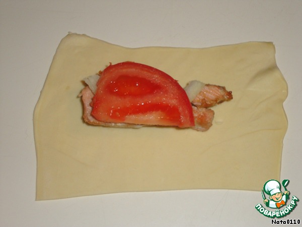 Из теста нарезаем квадраты (их размер зависит от размера рыбки). На тесто выкладываем рыбку, на рыбку лук, на лук помидор.