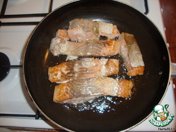 На сковороде обжариваем рыбку с двух сторон по 3 минуты.