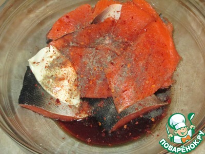 Уложить филе в миску, добавить соевый соус, 2 ст. л. майонеза, специи