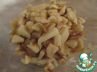 Когда грибы обжарятся, добавим нарезанный чеснок, слегка присолим, перемешиваем, еще немного обжариваем и убираем с огня.