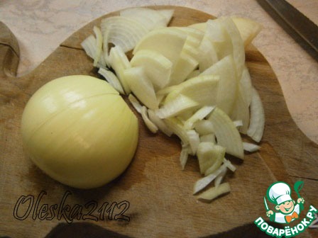 Лук чистим и режем полукольцами. Обжариваем на растительном масле до золотистого цвета.