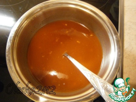 Готовим соус. Для этого наливаем томатный сок в сотейник. (Если используете томаты консервированные в соб. соку, то томаты размять и вместе с соком влить в сотейник). Добавляем измельченный чеснок, соль, уксус, сахар, перец чёрный молотый, перец красный молотый (или стручок свежего, разрезанный пополам и очищенный от семян). Ставим на плиту и нагреваем.