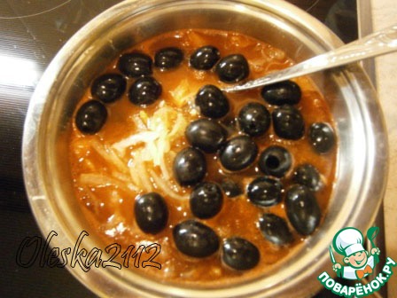 Соус провариваем на небольшом огне около 10 минут. Минуты за 3 до готовности выкладываем в соус пассерованный лук и оливки (маслины). Помешать.