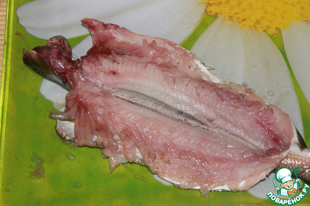 Рыбку чистим от чешуи, внутренностей, аккуратно удаляем хребет с реберными костями, отрезав его от головы.