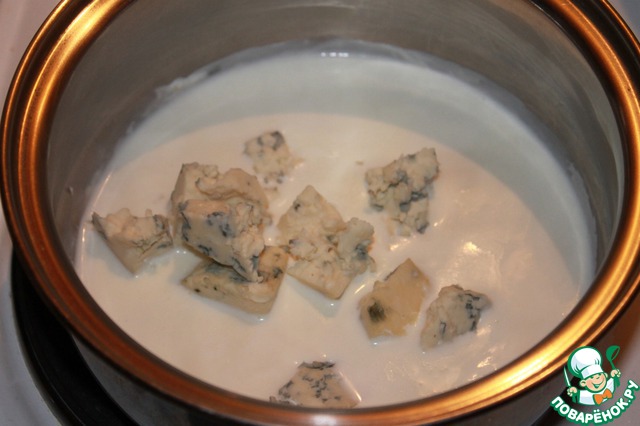 Подогреваем сливки, размешиваем вилочкой в них кусочек голубого сыра, пока не растворятся, сливочное масло, перчим по вкусу белым и черным перцем, добавляем цедру лайма.