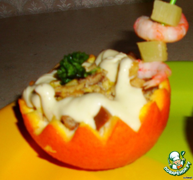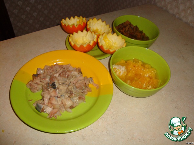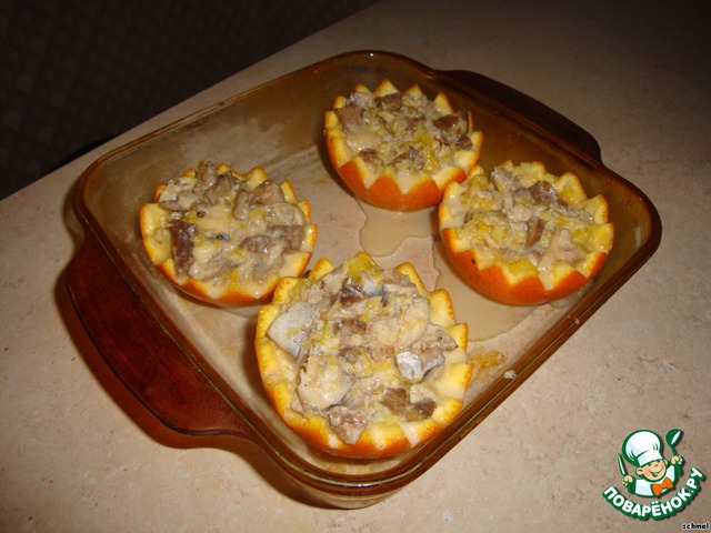 Апельсины разрезать пополам, вынуть мякоть, порезать небольшими кусочками. Филе рыбы нарезать кубиками, грибы порубить