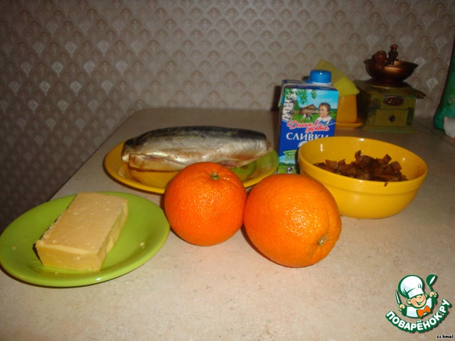 Грибы пожарить на сливочном масле, добавить туда же рыбу и апельсины, посолить, поперчить, через 5 мин. добавить сливки и тёртый сыр. Этой смесью наполнить апельсиновые чашечки. Запечь их в гриле или духовки 10 мин.