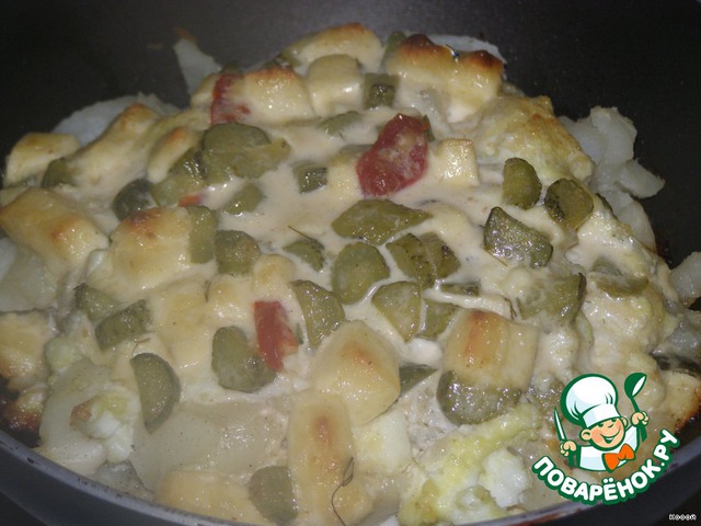 На форму выложить кусочками порезанную картошку,сверху выложить рыбку,поверх слой картошечки.Залить всё соусом.Посыпать тёртым яйцом.Поставить в предварительно разогретую духовку до золотистой корочки.