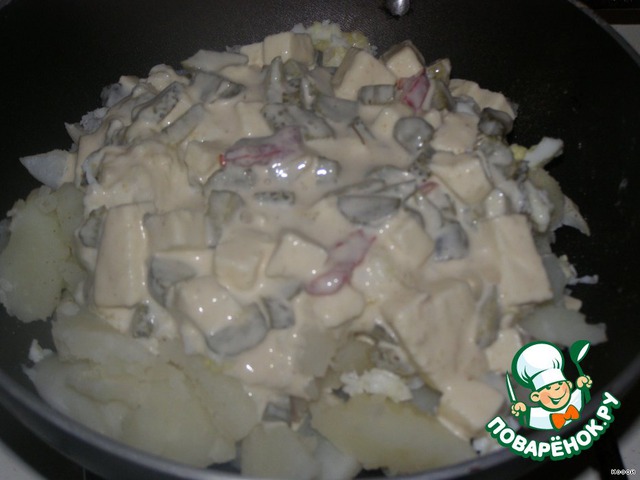 Приготовить соус:Смешать хрен,майонез,порезанные кубиками сыр и огурчики.