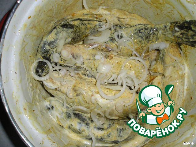 К рыбке добавляем сметану (можно майонез) и порезанный кольцами лук. Сметана заберёт запах реки и сделает рыбку нежной. Перемешиваем и оставляем минут на 20.