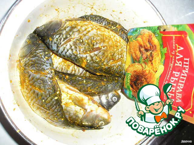 Почищенную с надрезами на спинке рыбу посыпаем специями для рыбы и добавляем немного соли.
