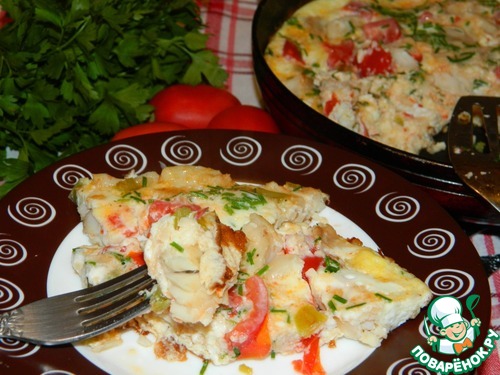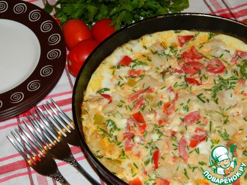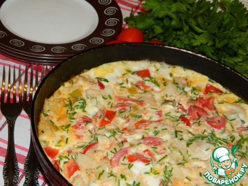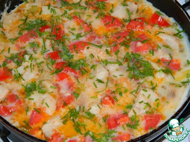 Добавить нарезанный помидоры. Перемешать. Залить все яичной смесью, сверху посыпать зеленым луком и оставить под крышкой на маленьком огне до готовности яиц.