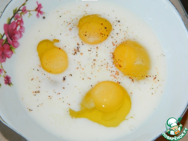 В отдельной чаше взбить яйца, молоко, соль, перец.