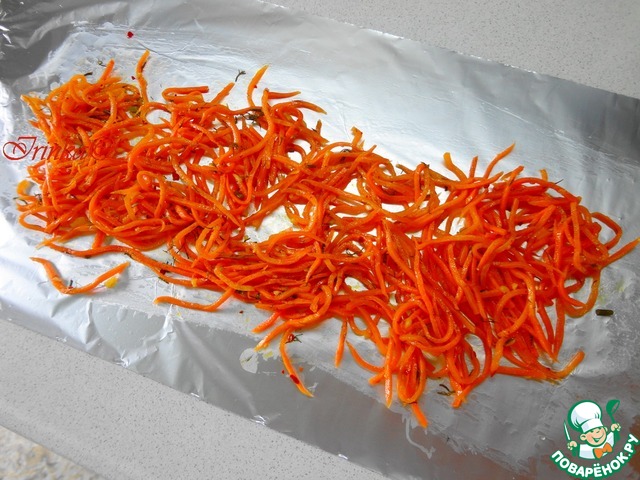 На столе расстилаем лист фольги, на него кладем половину морковки.