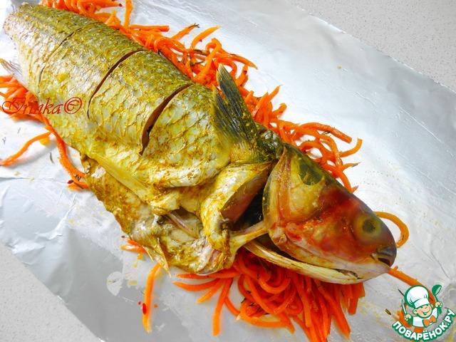На морковь укладываем рыбину. Делаем порционные надрезы.