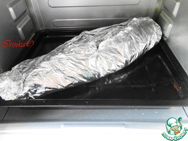Накрываем рыбу вторым листом фольги, хорошо закрепляем со всех сторон конвертом.