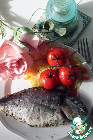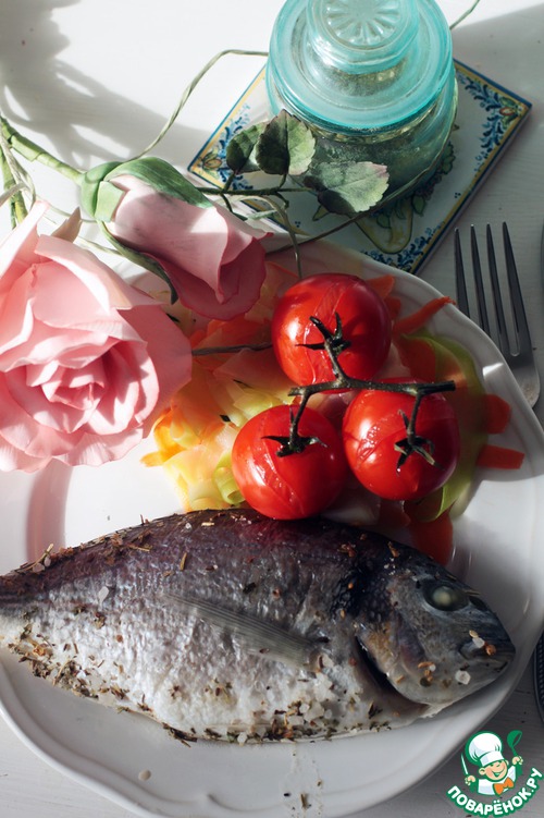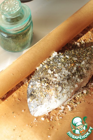 Для приготовления этого блюда нам понадобится свежая рыба. Я люблю дорадо - мало костей и отличный вкус. Рыбку мы моем, потрошим, выкладываем на бумагу для выпечки, посыпаем крупной солью и специями и отправляем в разогретую до 180 градусов духовку на 15 минут.