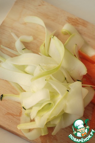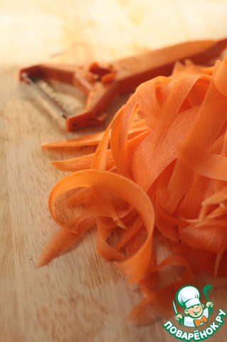 Пока наша рыбка готовится, займемся гарниром. Морковь мы помоем, почистим и нарежем тонкой "лапшой" при помощи ножа для чистки овощей.