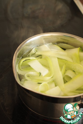 Поставим на плиту кастрюлю с водой, доведем ее до кипения и отправим наши кабачки на 3 минутки в горячую воду.