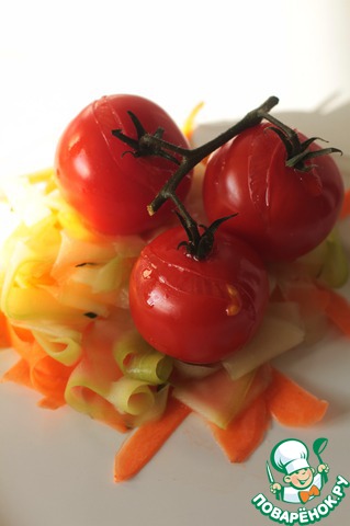 На тарелку выкладываем свежую "лапшу" из моркови и теплых кабачков. Украшаем веточкой черри из духовки.