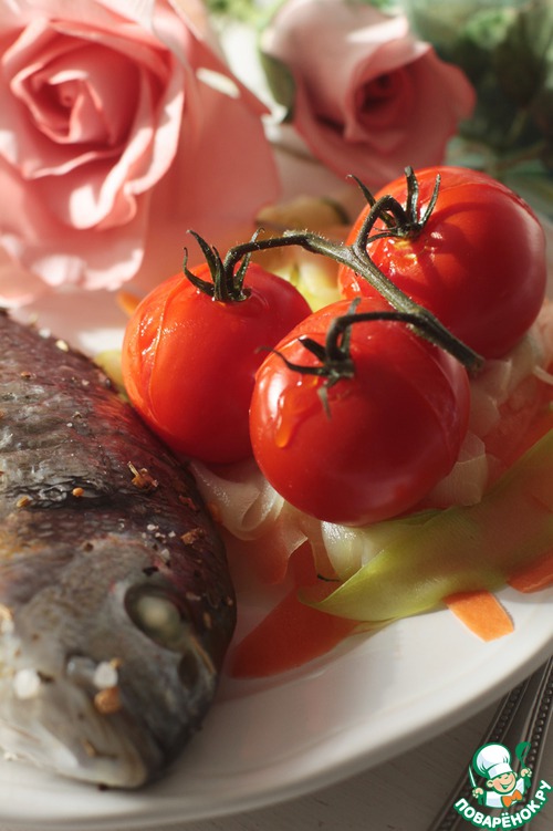 Достаем нашу рыбку из духовки и выкладываем к овощам. Вот такой простой, но не банальный обед или ужин готов! :)
