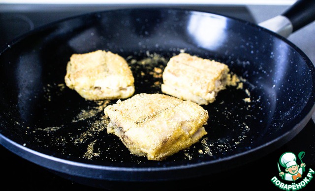 Хорошо запанировать рыбу со всех сторон в получившейся смеси. Разогреть сковороду с растительным маслом.